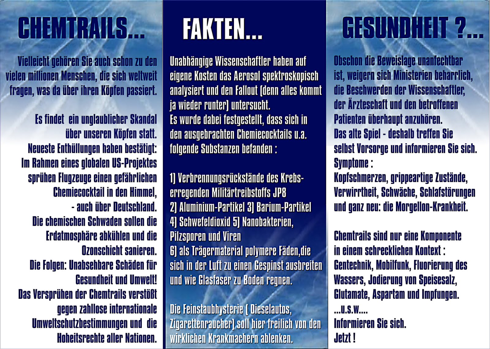 Hier noch zwei kompakte Infotexte, die auf Chemtrails.de und anderen Webseiten zu finden sind, die man auch ausdrucken und andere weitergeben kann.